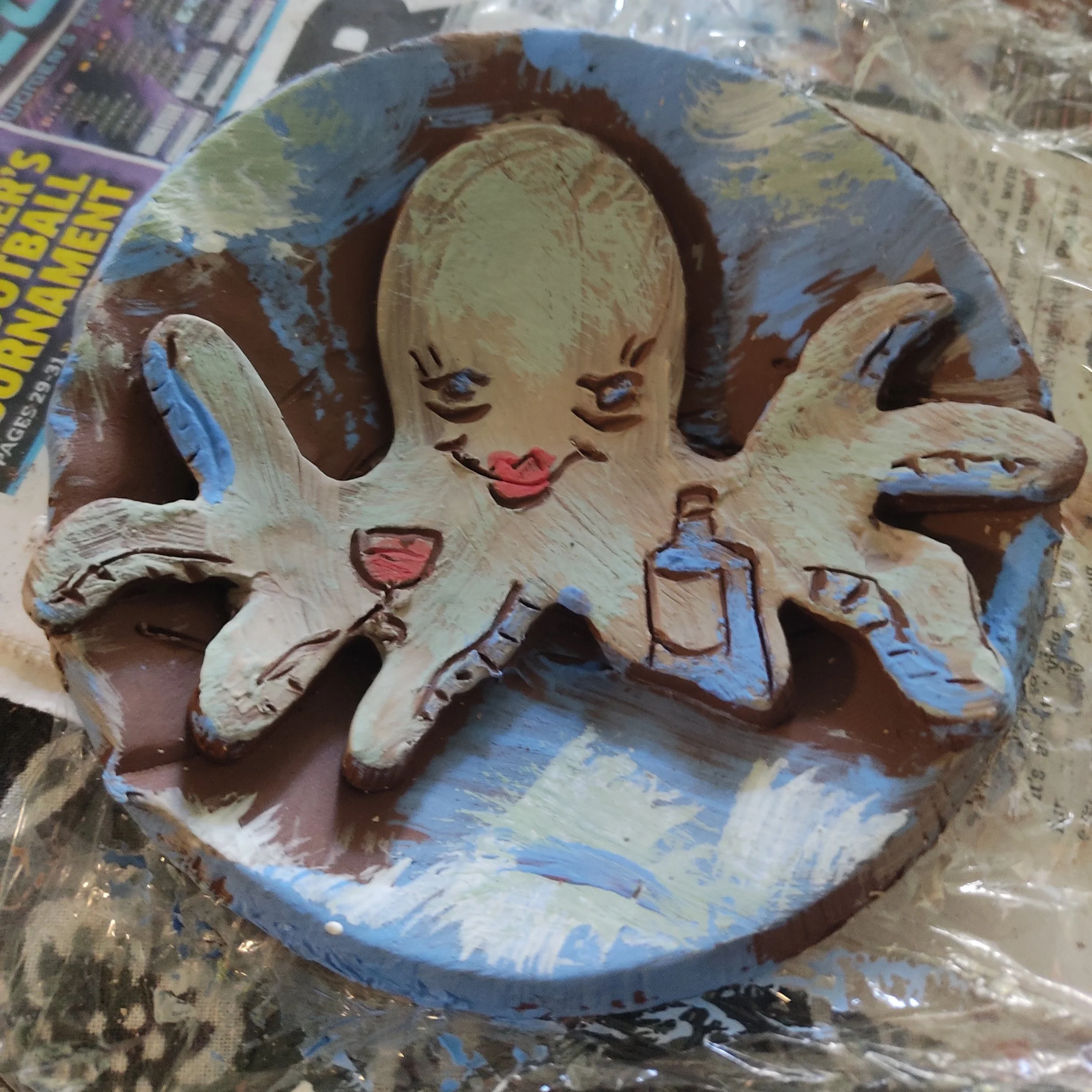 I do not get creative block, but I tend to not be in the mood sometimes. I have spurts where I make a lot and then have lulls. My inspiration comes from wordplay and forms. I just did a bowl based on an old tulip drawing where the leaves looked like arms, so I gave it legs. I draw birds in high heels, which is ironic as I cannot wear them. I am fortunate to not have a shortage of ideas, just not the technical brain to make them real. I would love to be more three dimensional, but my head is two dimensional.