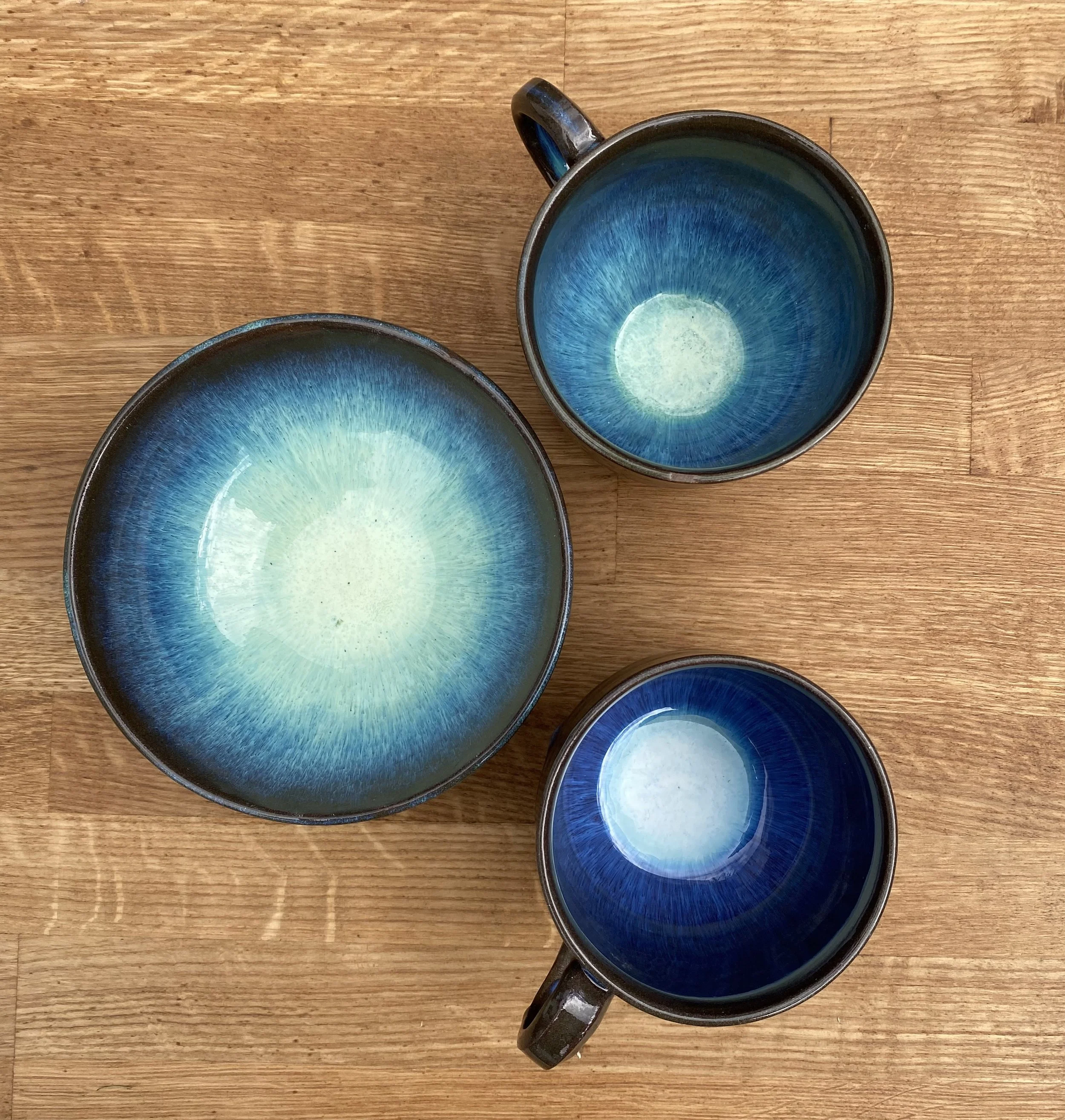 I find I’m most likely to get creative block when looking at a table full of pieces to glaze and at that point I am usually on some sort of deadline. I keep a folder of inspiration pictures on my phone for those situations; anything that captures my attention like a beautiful sunset, bright blue sky against a sandy beach, vivid green leaves in spring and it usually fires up my imagination to come up with some nice glaze colour combinations.
